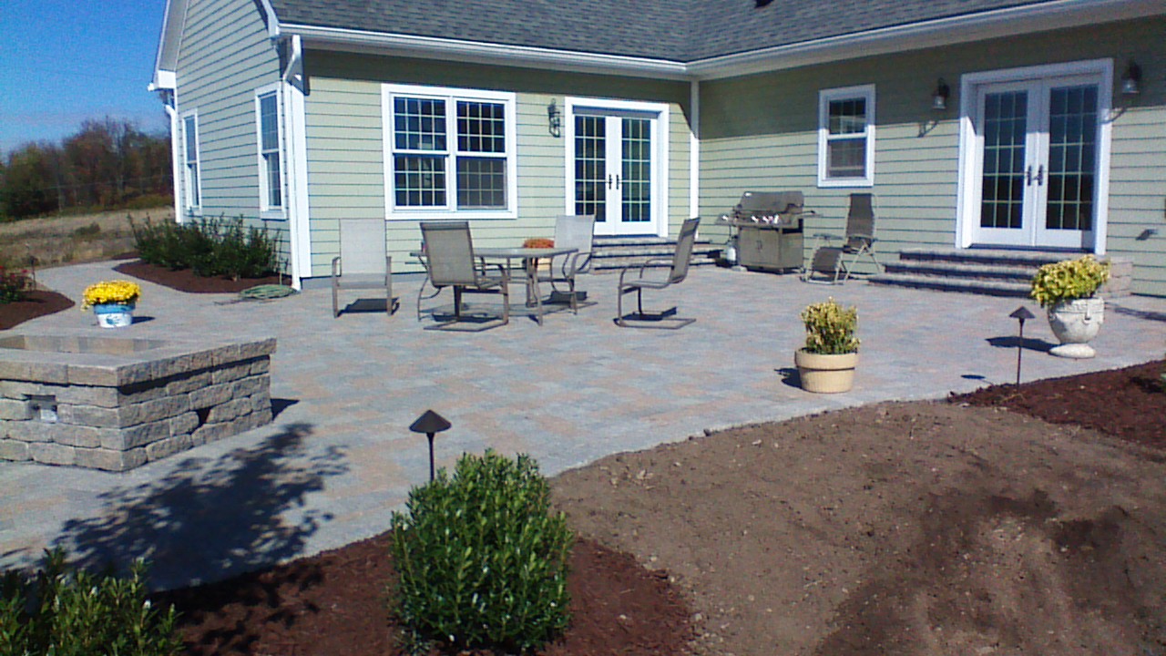 Steps, paver patio, grade, trees, shrubs, perennials, mulch, hydroseed, LED landscape lighting